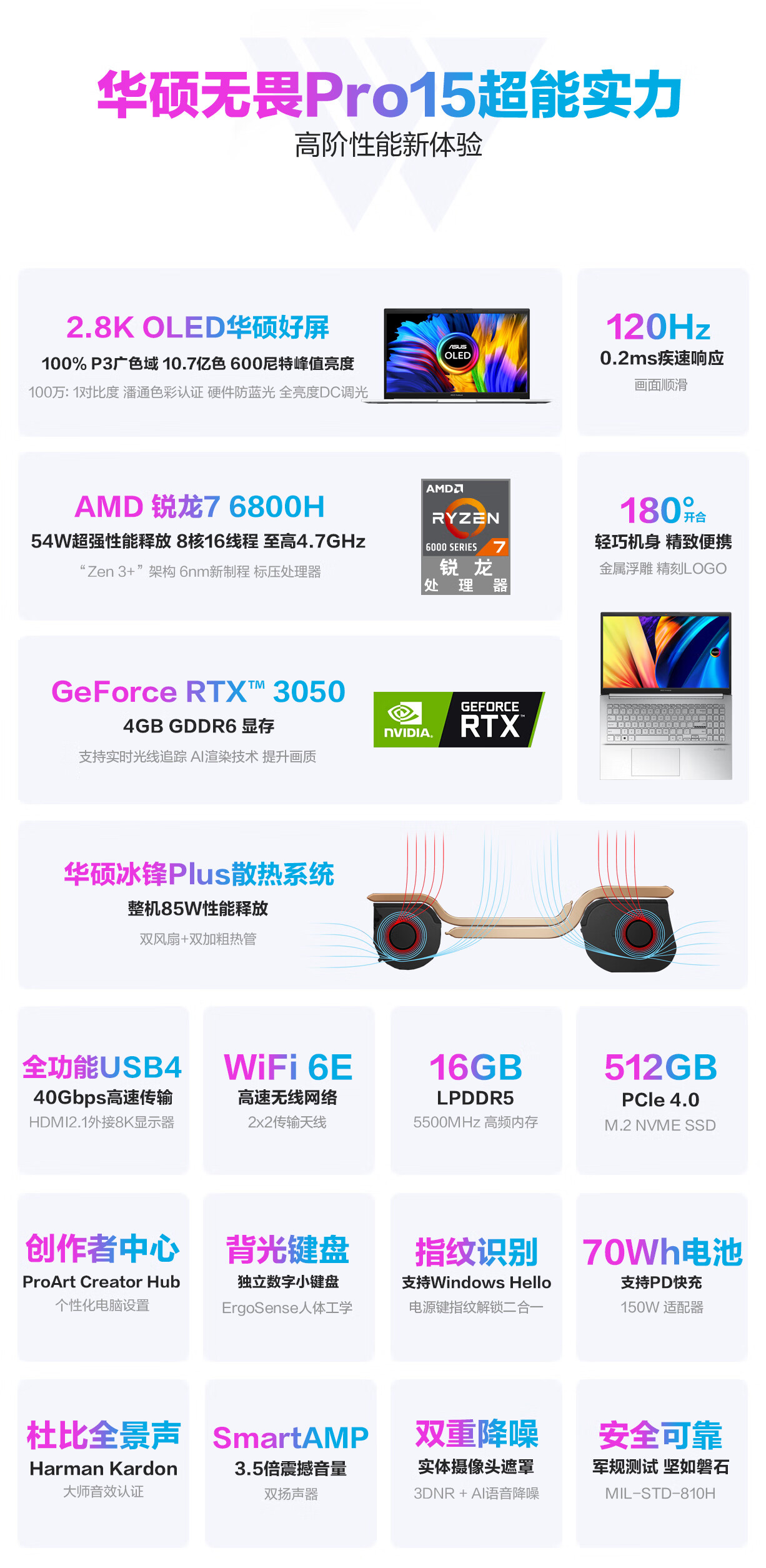 华硕无畏Pro15 2.8K 120Hz OLED屏新锐龙标压游戏轻薄笔记本电脑(R7-6800H 16G 512G RTX3050高色域)银